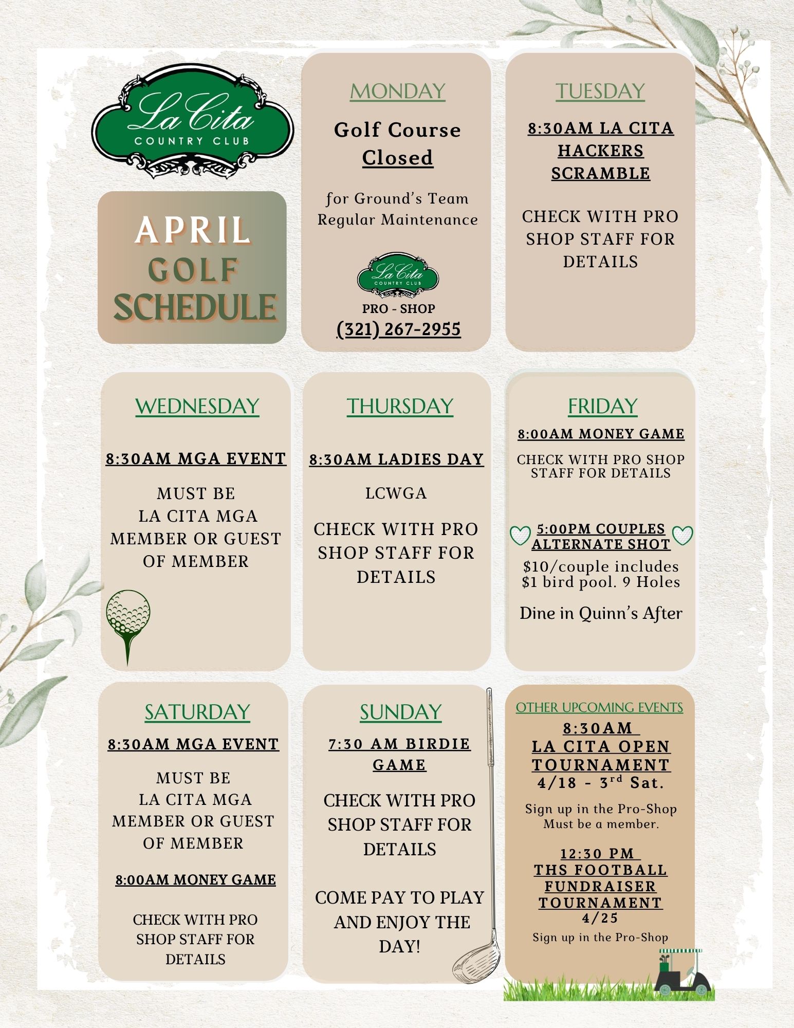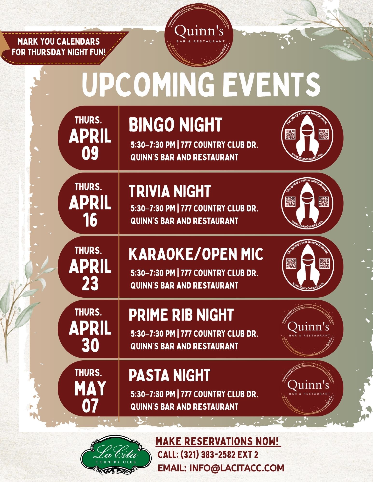 Please note: If there are no member or guest reservations and no one is present by 7:30 PM, the kitchen will close for the evening.